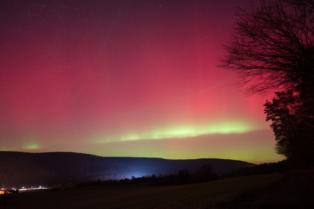 Das Panorama (Blick nach Westen) zeigt die großräumige Ausdehnung des Polarlichts über Lohr und Lohr-Steinbach und den umliegenden Horizont.