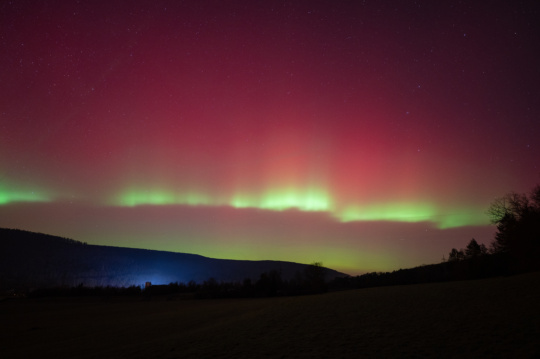 Polarlichter in der Bucht von Reykjavik vom Boot aus. Etwas verwackelt, da man beim Fotografieren gegen Wind und Wellen ankämpfen musste.